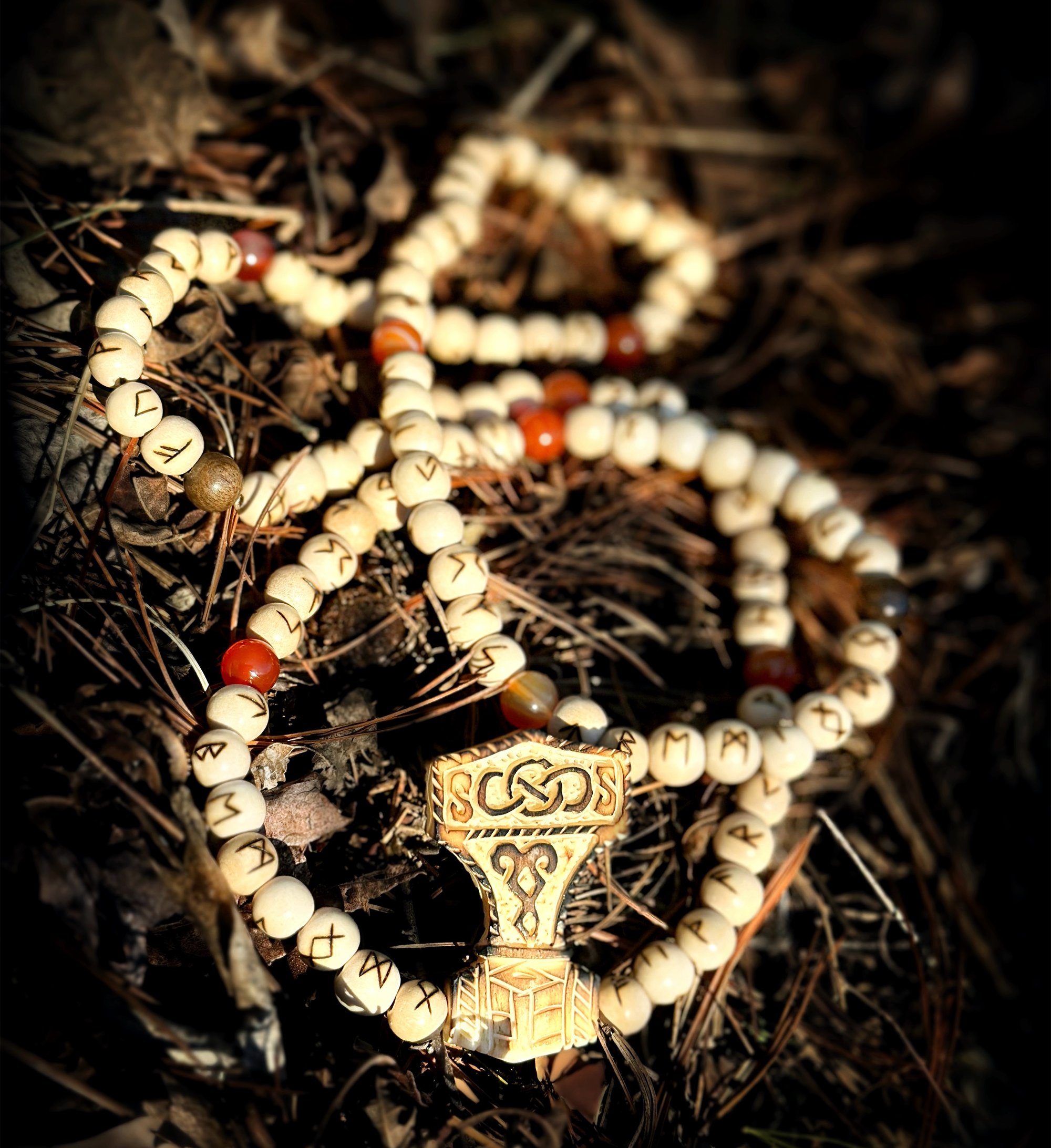 The Mala and stringing done by Desert Rose Arts, the bone Mjolnir was crafted by an anonymous artist.